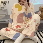 Winter New Flannel Sleepwear Thickening Round Neck Long Sleeve Women’s 2 Pieces Set Cute Dinosaur Printing Home Suit for Women