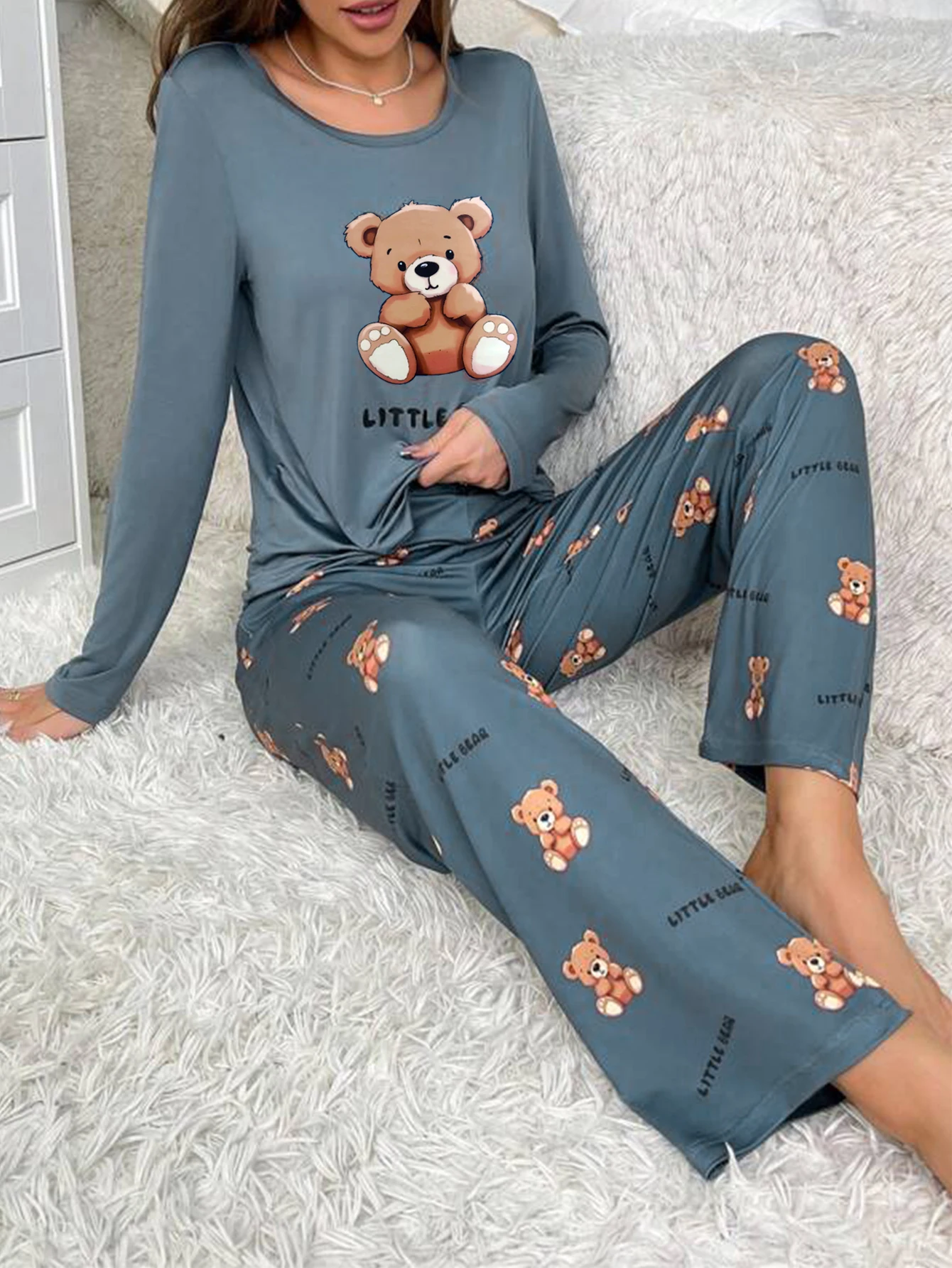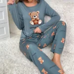 Women Sleepwear Set Autumn Pajama Set Cartoon Bear Print Cute Crew Round Neck Long Sleeve Top Allover Prints Pants Homewear Set