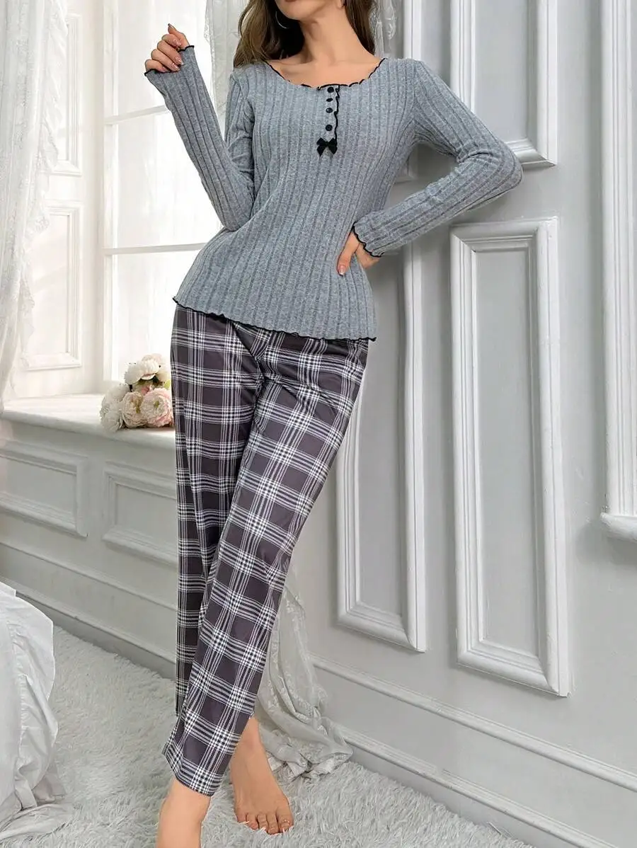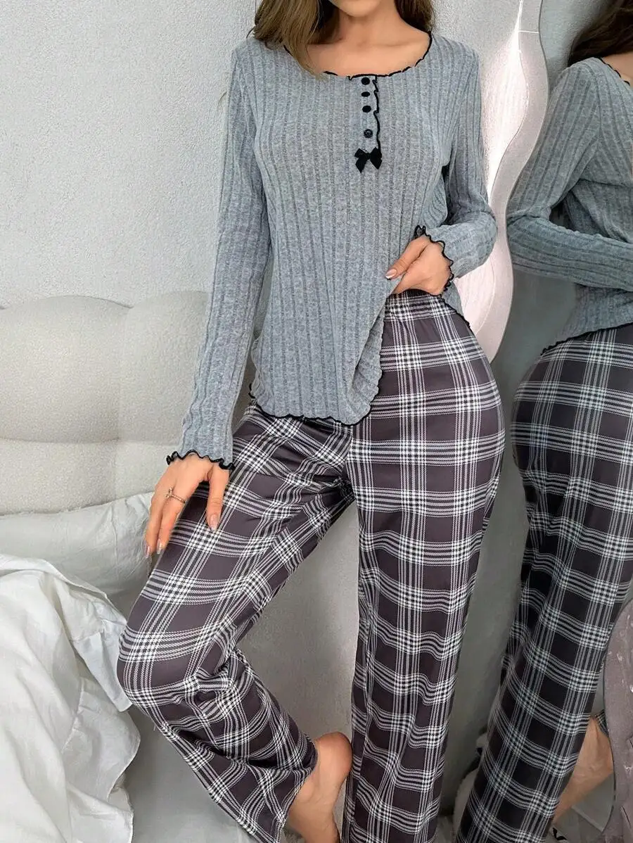 Women's Pajama Set Solid Long-sleeved Top with Plaid Trousers Suit Button Bow Trim sleepwear Loungewear Nighties