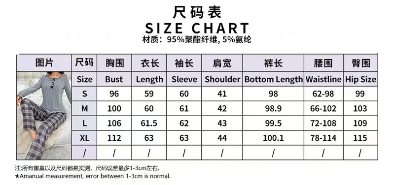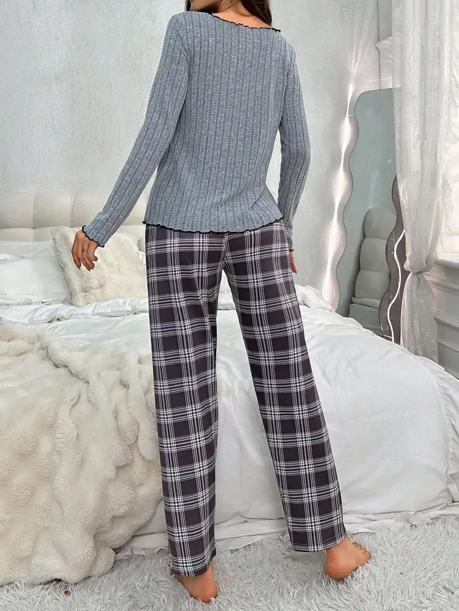 Women’s Pajama Set Solid Long-sleeved Top with Plaid Trousers Suit Button Bow Trim sleepwear Loungewear Nighties